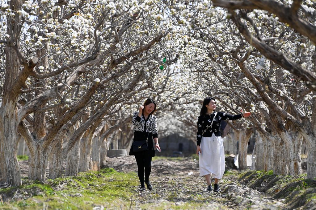 ↑4月10日,游客在新疆库尔勒市阿瓦提乡赏花游玩。
