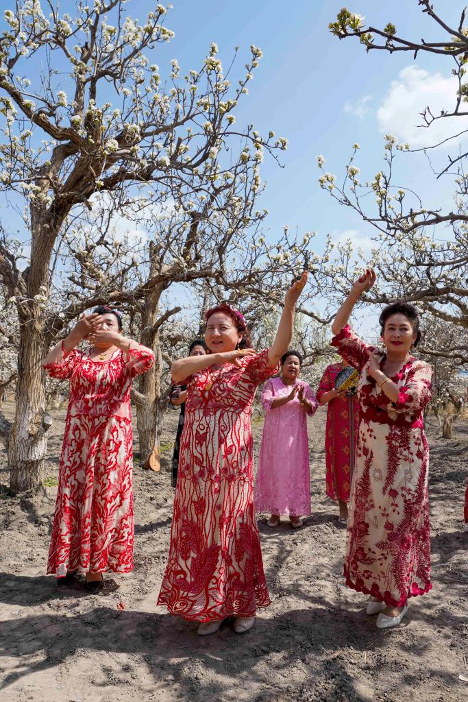 ↑4月10日,在新疆库尔勒市阿瓦提乡,一名舞蹈演员在梨树下闻花香。