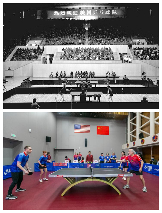 上图为1971年4月13日中美乒乓球运动员在北京首体的友谊赛。新华社发(资料照片);下图为2021年4月10日中美业余选手的友谊赛。新华社记者王翔摄