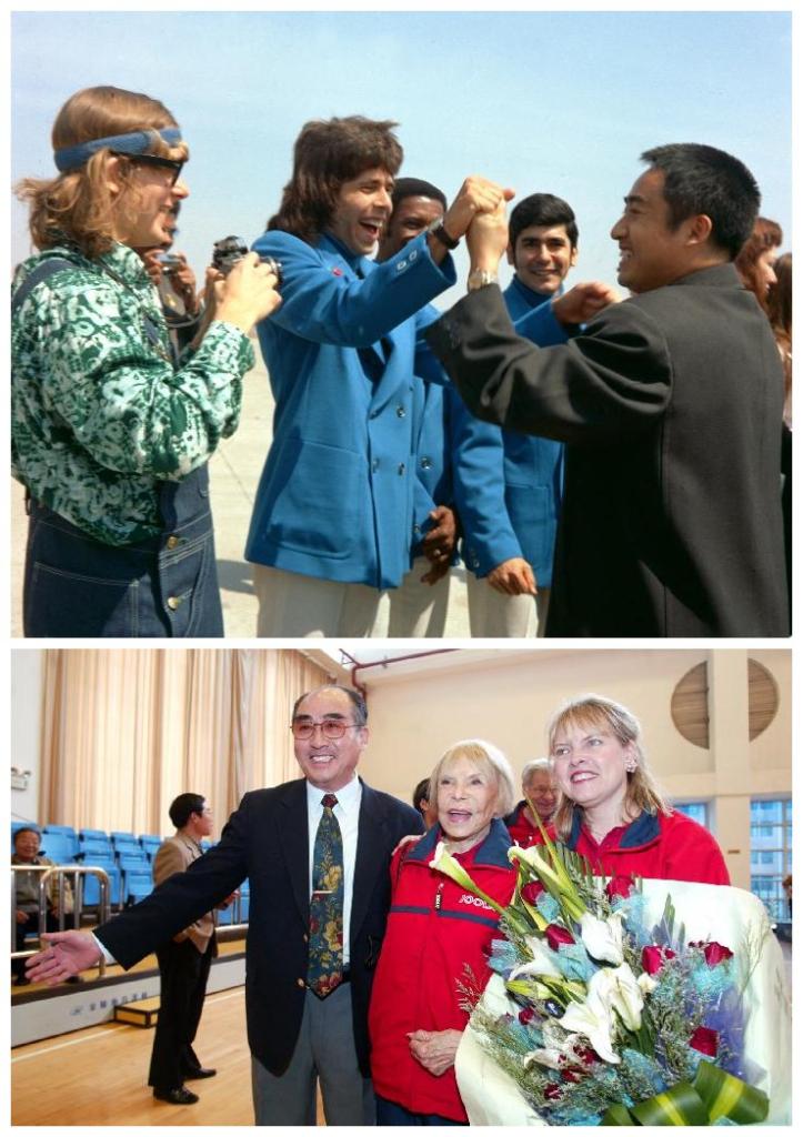 上图为1972年4月庄则栋与科恩握手。新华社记者许必华摄;下图为2006年3月31日庄则栋与科恩的母亲等合影。新华社记者凡军摄