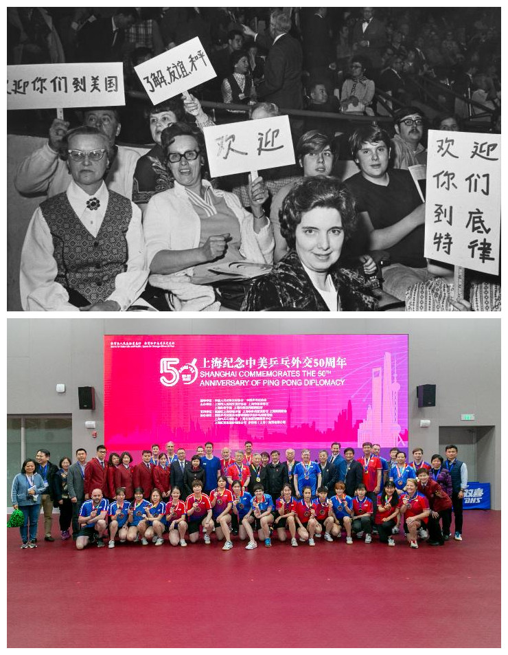 上图为中美乒乓球运动员在底特律比赛。新华社记者钱嗣杰摄;下图为2021年4月10日的纪念活动。新华社记者王翔摄