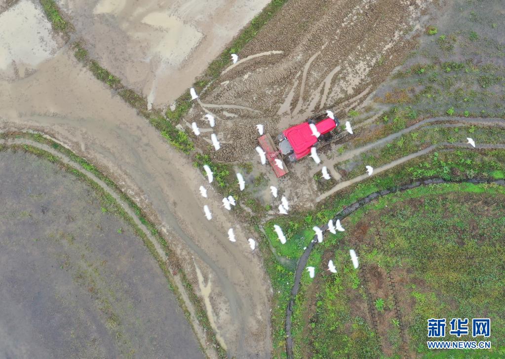 4月11日,在湖南省永州市道县富塘街道塘背村,农民驾驶农机在翻耕早稻田(无人机照片)。