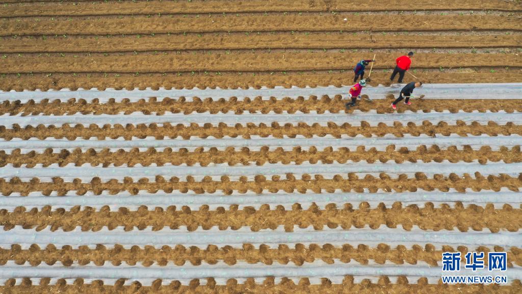 4月11日,河北唐山遵化市平安城镇莲藕池村农民在田间给栽植的南瓜秧苗铺膜(无人机照片)。