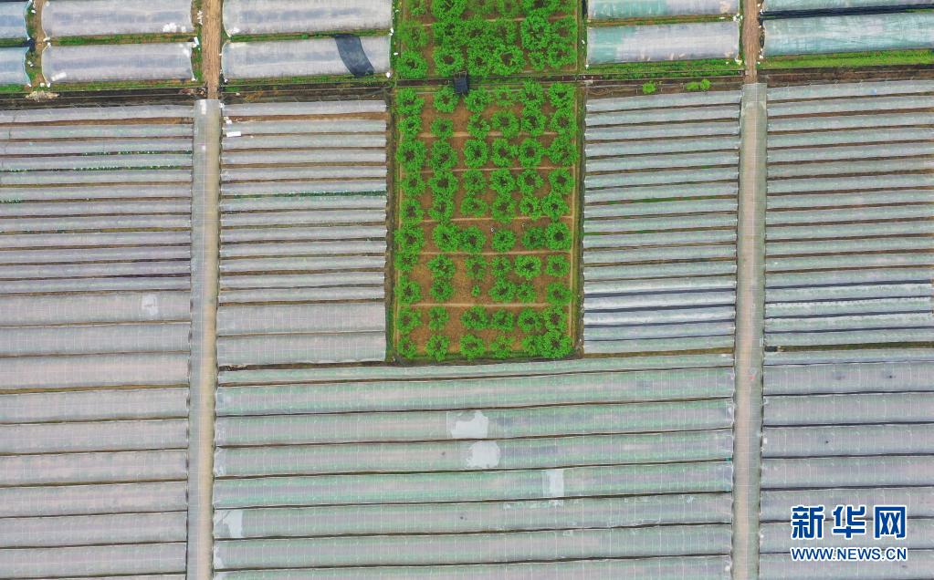 4月11日,在湖南省衡阳市祁东县赵坪铺村果蔬种植基地,村民对桃树进行剪枝作业(无人机照片)。