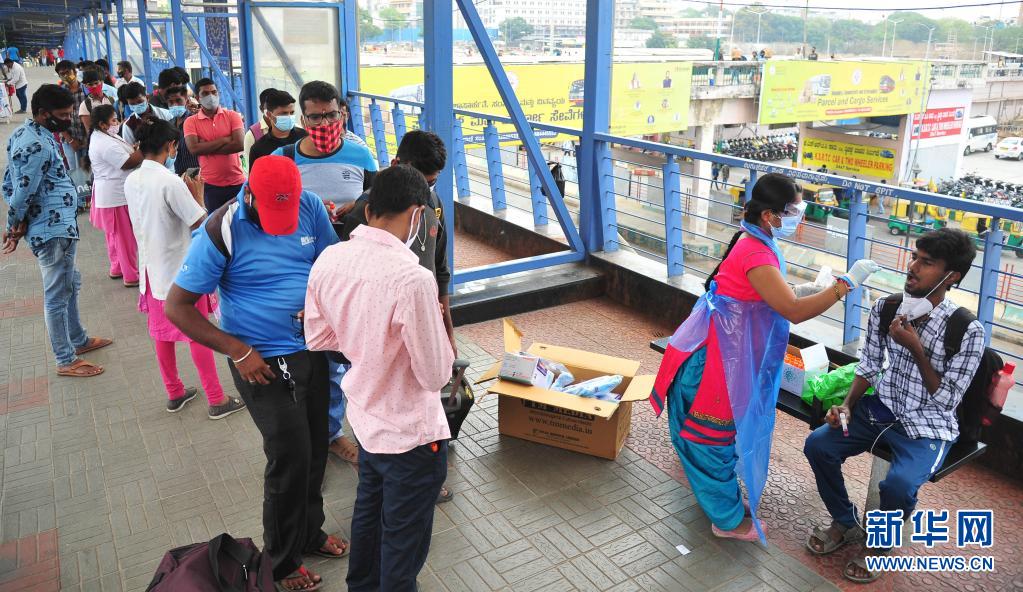4月11日,人们在印度班加罗尔的一个公交站接受新冠病毒检测取样。新华社发