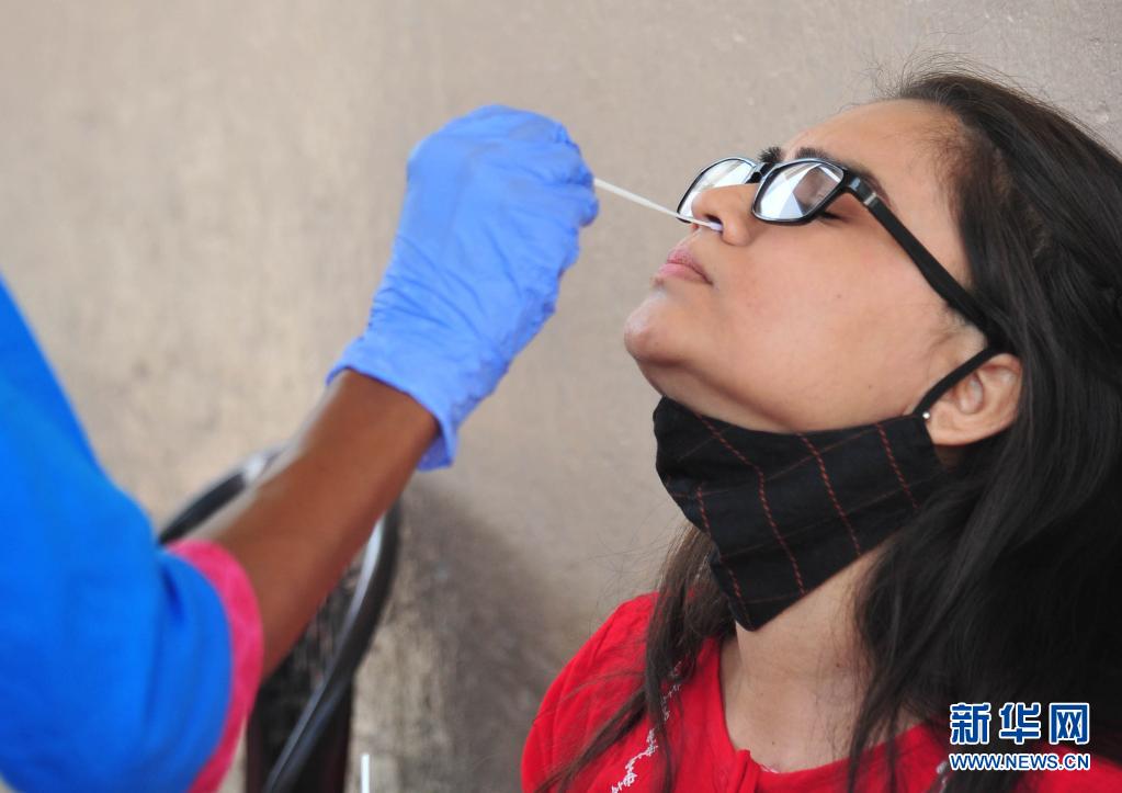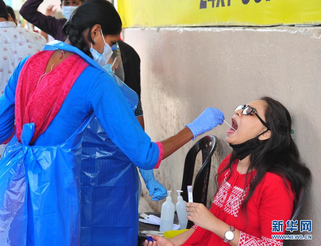 4月11日,一名女子在印度班加罗尔的一个公交站接受新冠病毒检测取样。新华社发