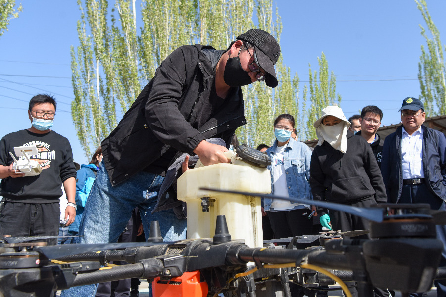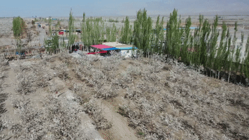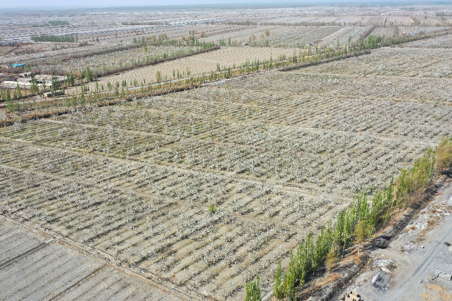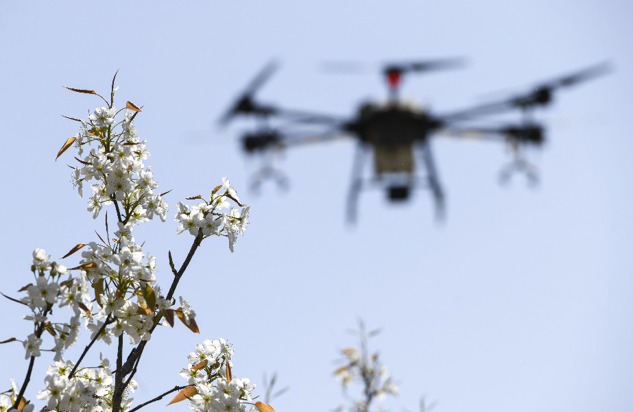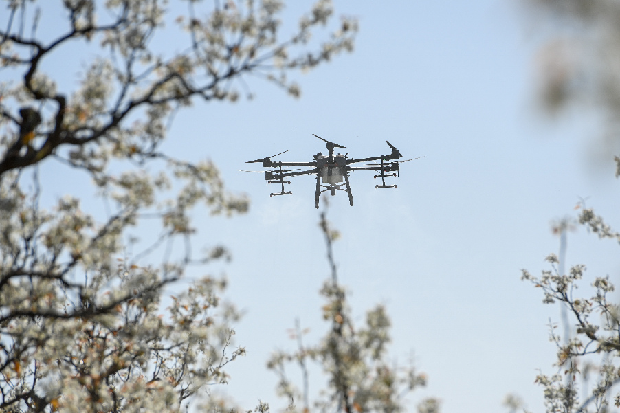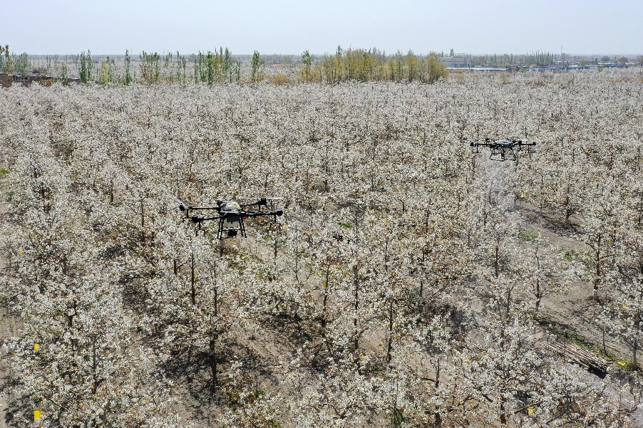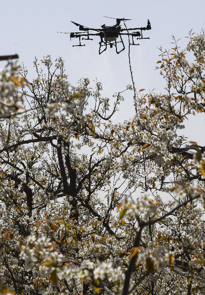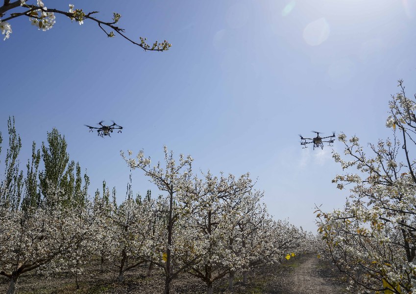 4月11日,在新疆铁门关市一处香梨示范园里,无人机在执行高效液体授粉作业。
