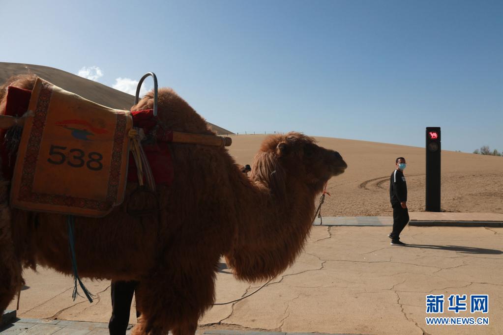 4月11日,敦煌市鸣沙山月牙泉景区的交通信号灯“红骆驼灯”亮时,农户牵着骆驼等候。