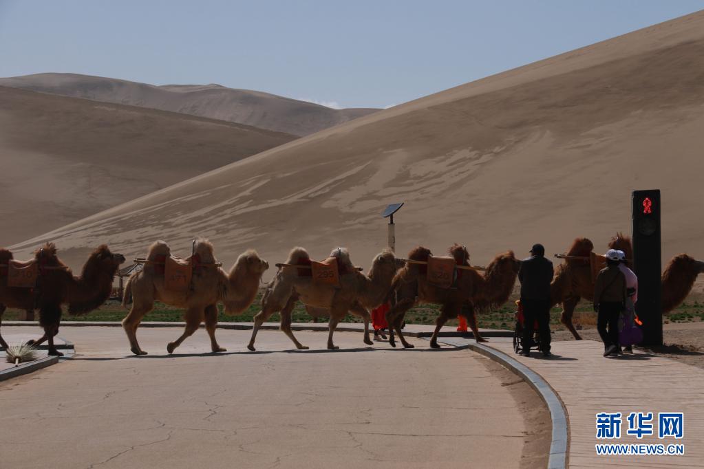 4月11日,敦煌市鸣沙山月牙泉景区的交通信号灯“行人红灯”亮时,驼队有序通过,游客在一旁等候。