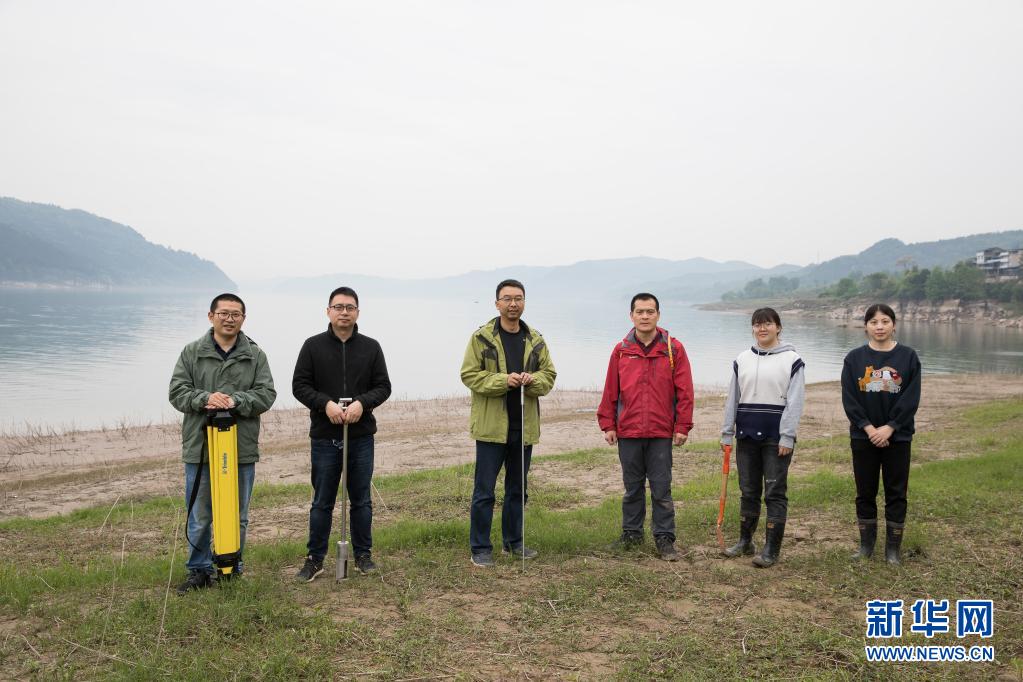 4月10日,在位于重庆忠县石宝镇的三峡库区消落带上,部分科研人员合影。