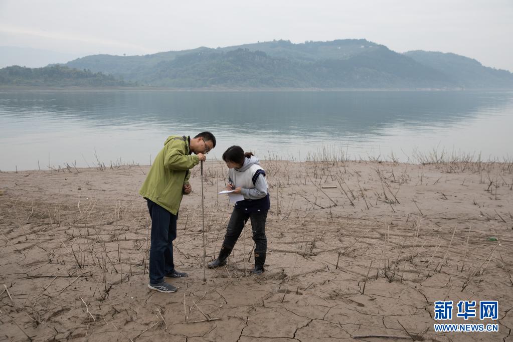 4月10日,在位于重庆忠县石宝镇的三峡库区消落带上,中科院三峡库区水土保持与环境研究站副站长龙翼(左)和学生郑晓岚在监测土壤力学性质。