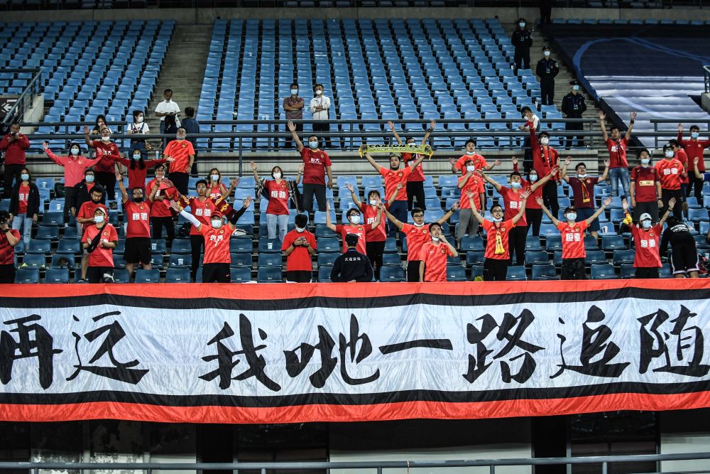 2020年9月4日,广州队球迷赛后庆祝球队获胜。新华社记者潘昱龙摄
