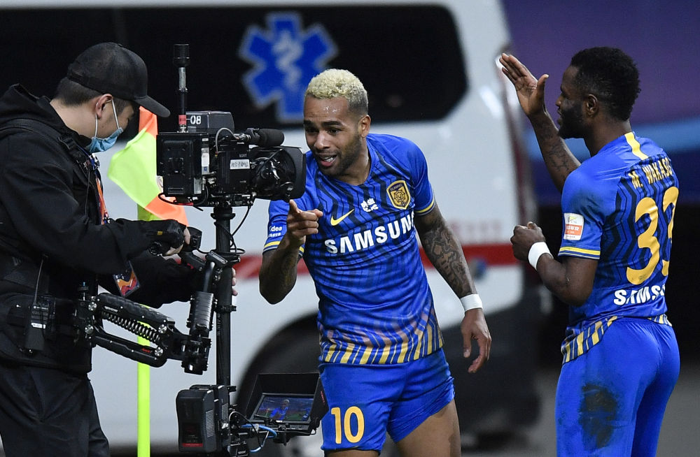 2020年10月29日,上赛季效力江苏队的球员特谢拉(中)在比赛中庆祝进球。新华社记者许畅摄