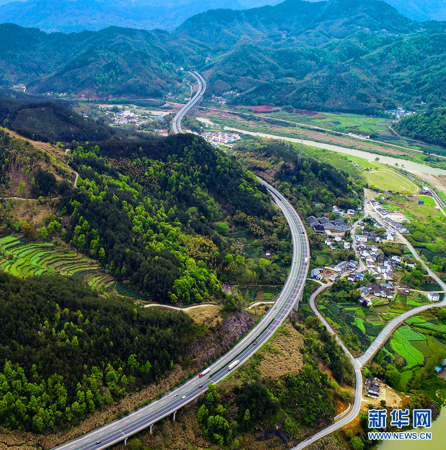 4月8日,在安徽省潜山市水吼镇境内航拍的六潜高速公路。新华网发(王先国 摄)