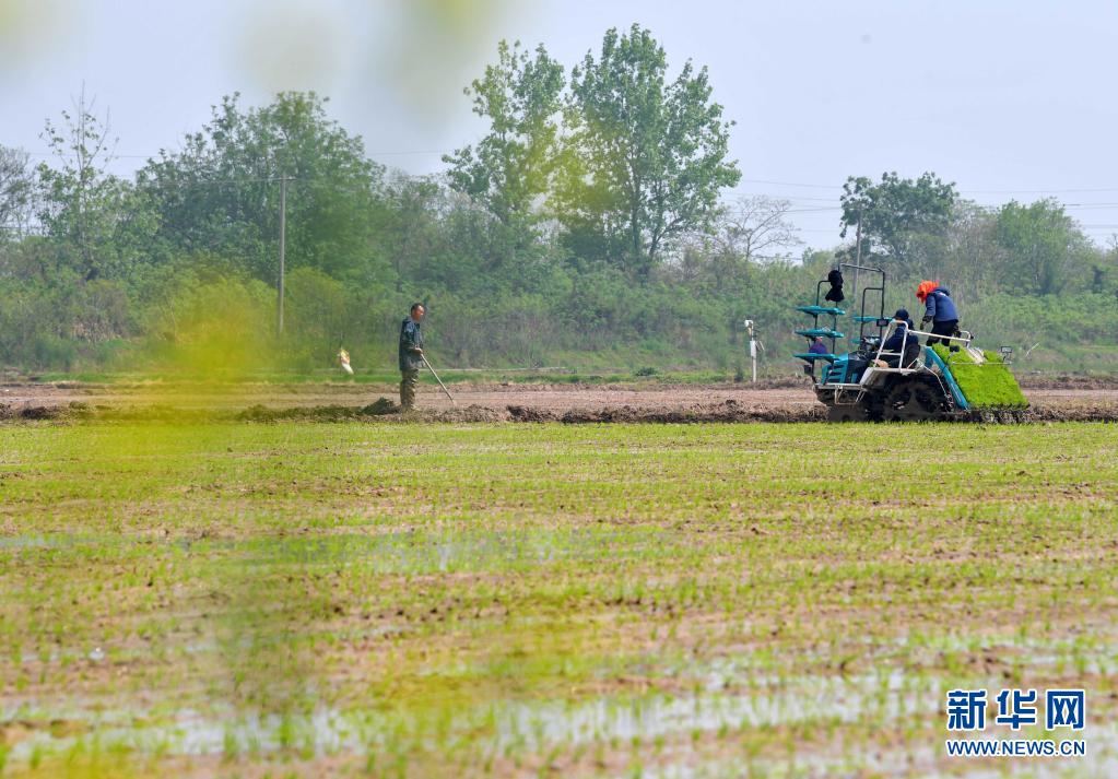 4月13日,在江西省南昌县蒋巷镇,当地农户在田间进行插秧作业。