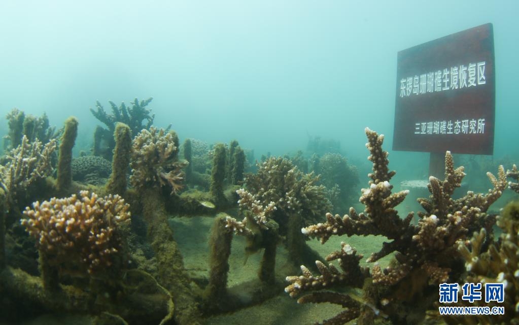 这是海南三亚崖州湾东锣岛周边海域的珊瑚礁生境恢复区(3月18日摄)。