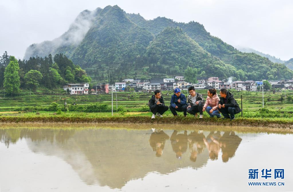 4月12日,在贵州省麻江县,南京农业大学教授李刚华(左二)带着学生与种粮大户赵祥榕(右一)商讨水稻播种育苗相关事宜。 新华社记者 杨文斌 摄