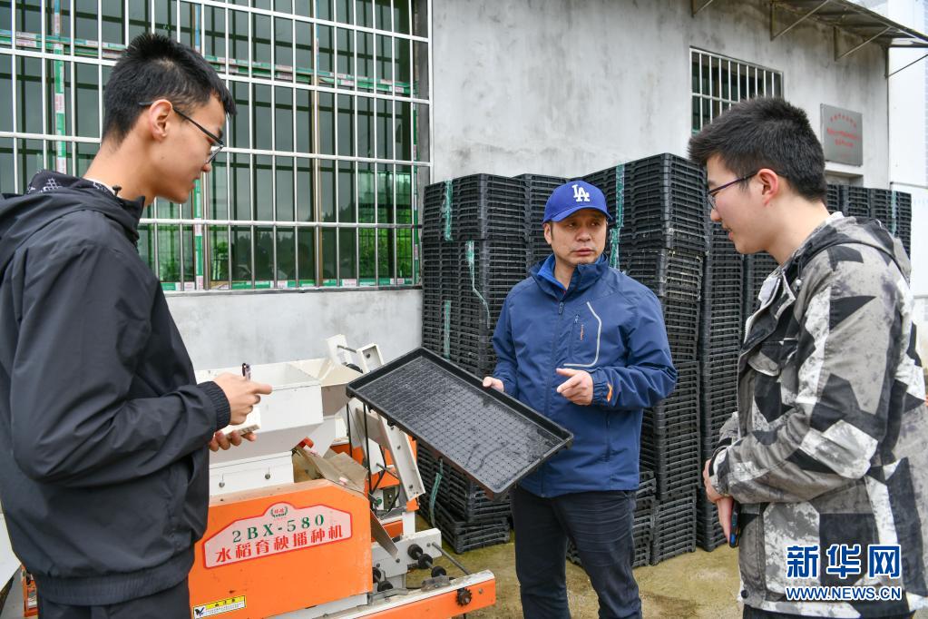 4月12日,在贵州省麻江县,南京农业大学教授李刚华(中)向随行学生讲解水稻育秧播种机的使用方法。 新华社记者 杨文斌 摄