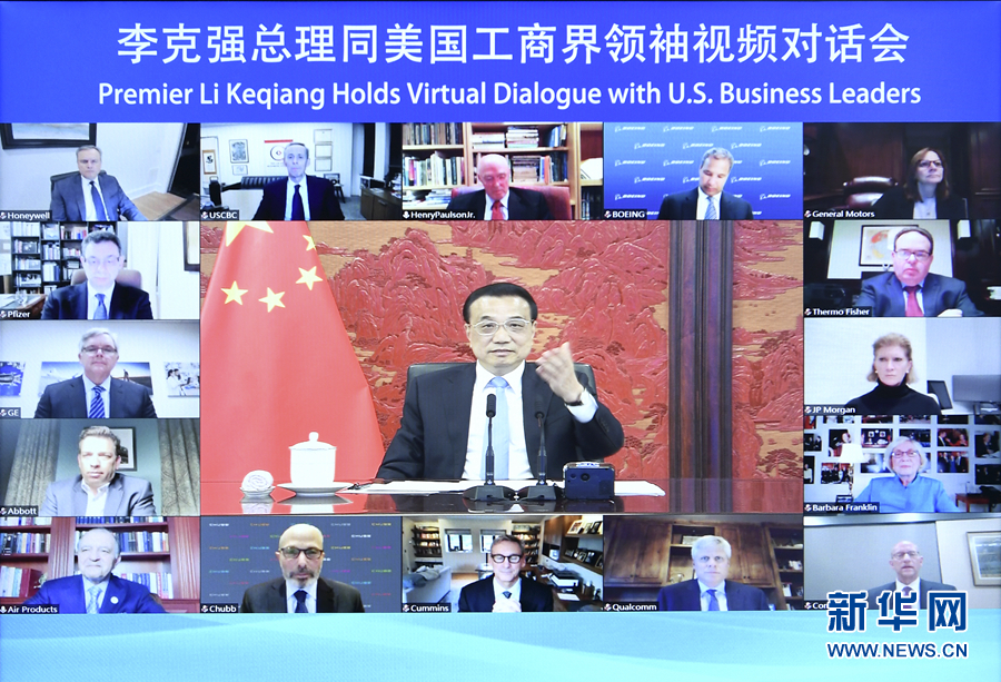 4月13日,国务院总理李克强在北京中南海紫光阁出席同美国工商界领袖视频对话会。新华社记者 燕雁 摄