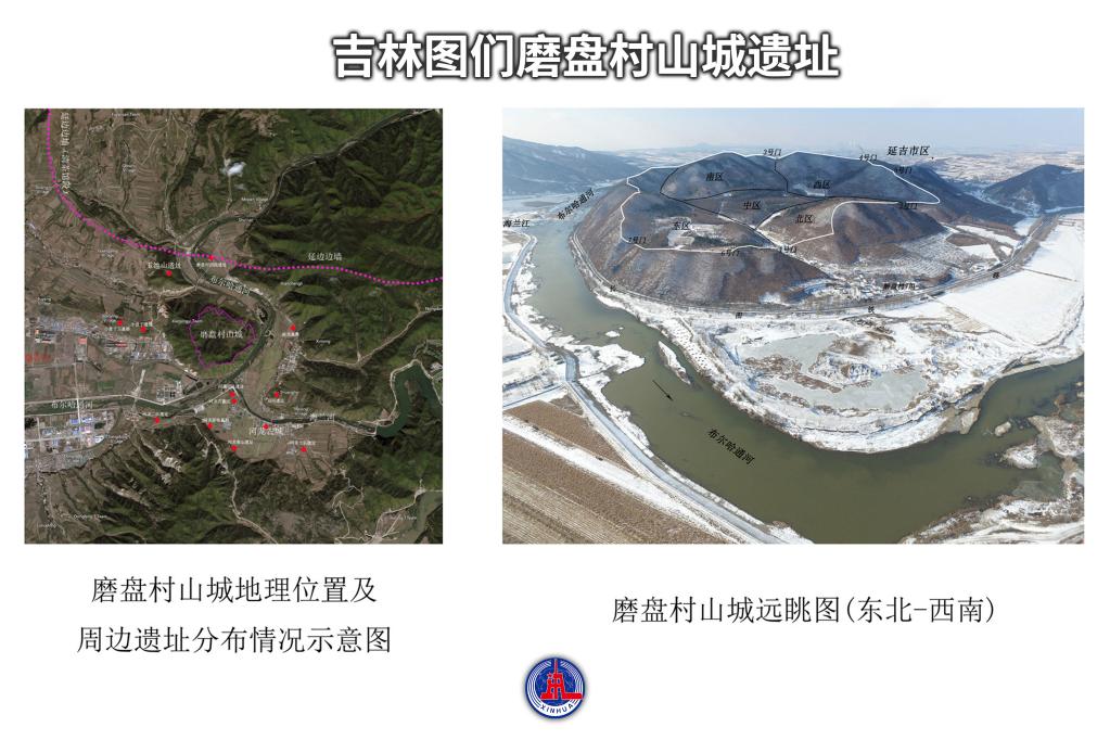 吉林图们磨盘村山城遗址,坐落于吉林省延边朝鲜族自治州图们市,该城南高北低,城墙沿山脊、山腹修筑,平面呈阔叶状,周长4549米。考古发掘表明,该城应为东夏国时期城址。