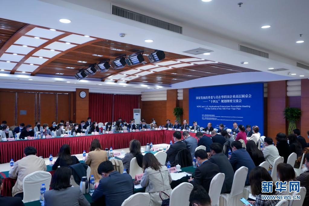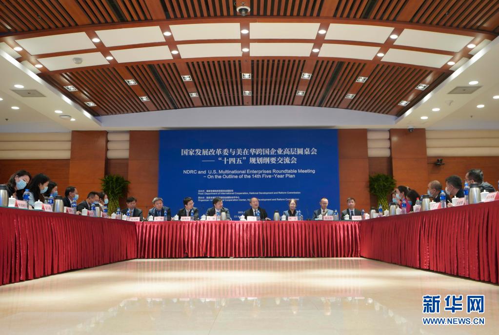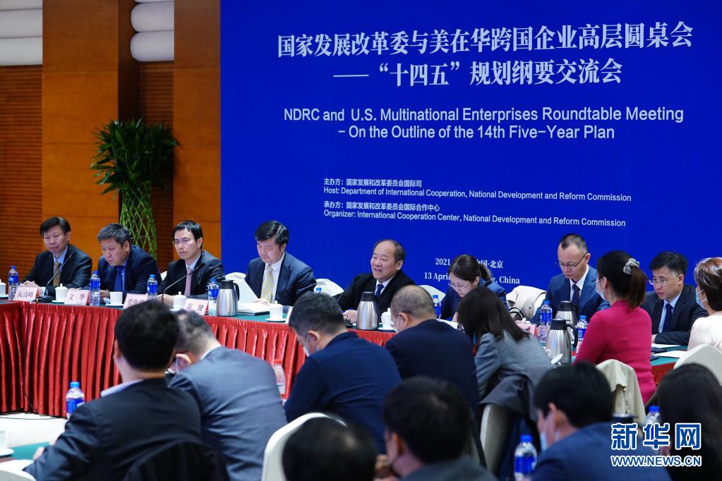 4月13日,国家发展改革委与美在华跨国企业高层圆桌会——“十四五”规划纲要交流会在中国科技会堂举行。来自47家美国在华商会、企业的60位代表与国家发展改革委副主任宁吉喆及相关司局负责人围绕“十四五”中国发展和市场机遇进行深入交流。新华社记者 邢广利 摄