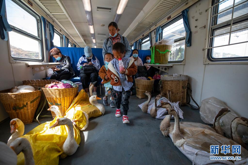在5633次列车上,小朋友走过两边放着家禽的车厢(4月11日摄)。新华社记者 沈伯韩 摄