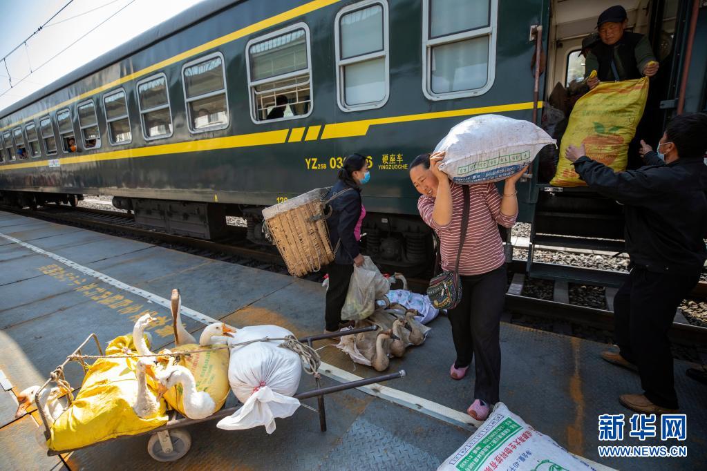 5633次列车停靠车站后,彝族小商贩忙着把货卸下来(4月11日摄)。新华社记者 沈伯韩 摄
