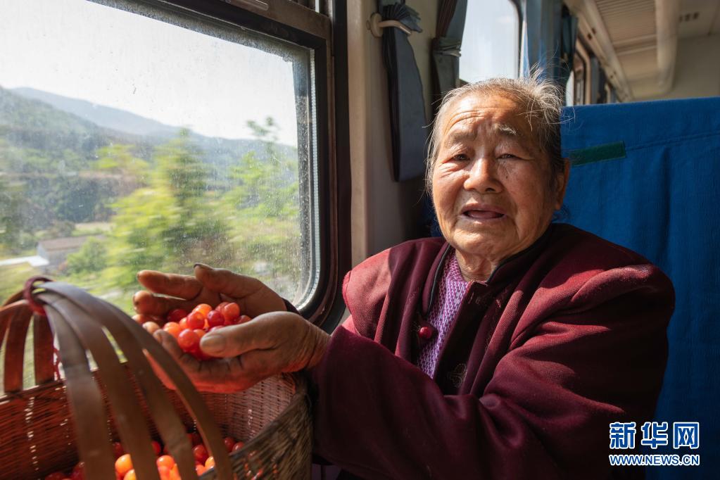 冕宁县村民马光玉带着自家种的樱桃前往西昌出售,每天她都会搭乘5633/5634次列车往返西昌和冕宁(4月11日摄)。新华社记者 胥冰洁 摄