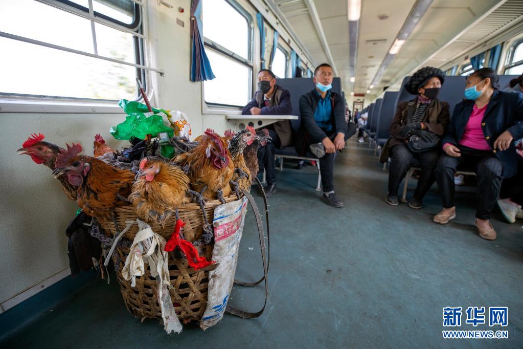 5633次列车上摆放着一筐要被乘客带到西昌集市上出售的鸡(4月11日摄)。新华社记者 沈伯韩 摄