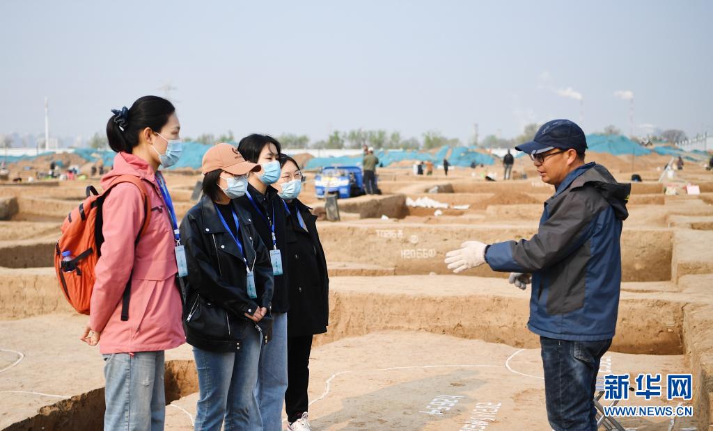 在安阳殷墟的一处考古工地上,考古志愿者们听安阳市文物考古研究所工作人员申文喜讲述操作要点(4月8日摄)。新华社记者 张浩然 摄