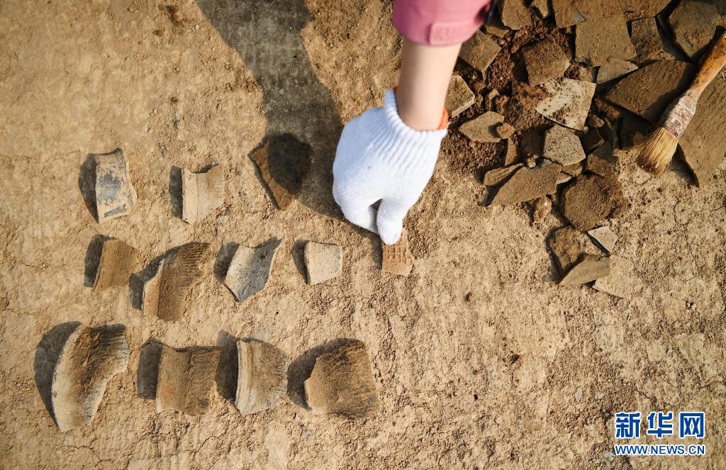 考古志愿者陈超按照考古工作人员的讲解为一座龙山文化灰坑出土的陶器残片分类(4月8日摄)。新华社记者 张浩然 摄