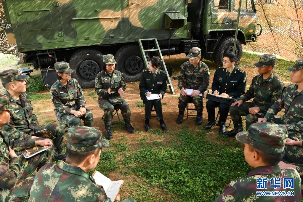 全军党史学习教育宣讲团成员、国防科技大学文理学院副教授傅婉娟(中)在训练场与火箭军某部官兵讨论交流(3月20日摄)。新华社发(黄建建 摄)