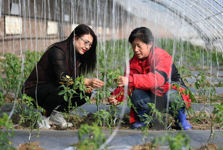 3月1日,石永苓(左)和农户在大棚内查看农作物生长情况。2000年,石永苓和丈夫靠着2万元小额贷款建起蔬菜大棚,从此走上致富路。新华社记者 李然 摄