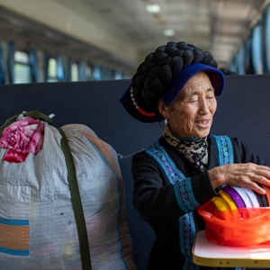 在5634次列车上,75岁的彝族妇女拉衣阿呷在整理她从西昌进的货(4月12日摄)。拉衣阿呷是5633/5634次列车的常客,她每两周就要坐火车到西昌批发小商品。新华社记者 沈伯韩 摄
