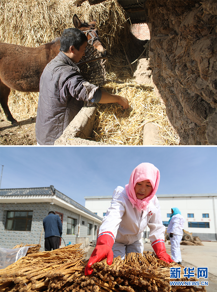 拼版照片:上图为2013年3月4日拍摄的甘肃省定西市渭源县元古堆村村民在家养驴的情景。新华社发(吴鲁 摄);下图为2019年3月11日,在渭源县元古堆村,甘肃圣源中药材有限公司就业扶贫车间员工在晾晒中药材。新华社记者 马希平 摄