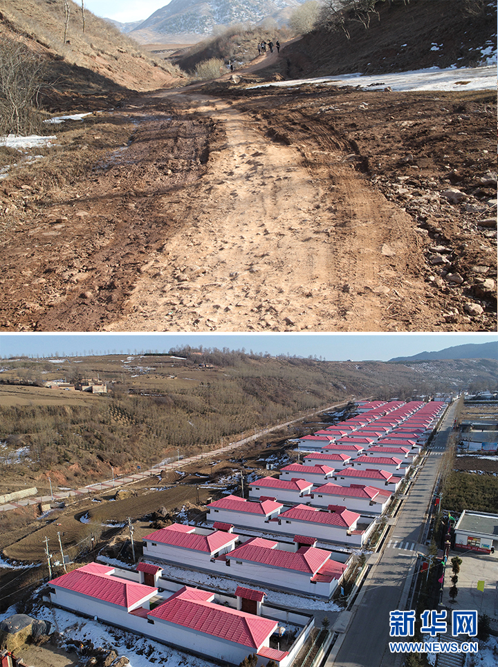 拼版照片:上图为2013年3月4日拍摄的甘肃省定西市渭源县元古堆村乡道。新华社发(吴鲁 摄);下图为2021年2月6日在渭源县元古堆村拍摄的乡村道路和易地扶贫搬迁点。新华社记者马希平摄