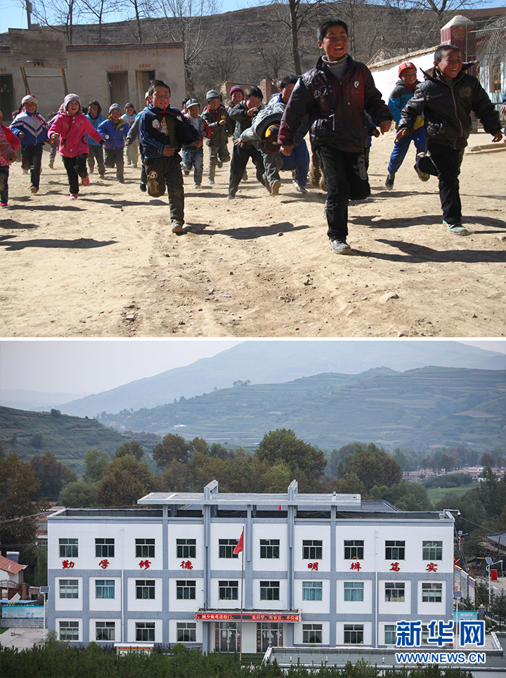 拼版照片:上图为2013年3月4日拍摄的甘肃省定西市渭源县元古堆小学学生在课间活动。新华社发(吴鲁 摄);下图为2020年8月22日拍摄的渭源县元古堆小学。新华社记者 马希平 摄