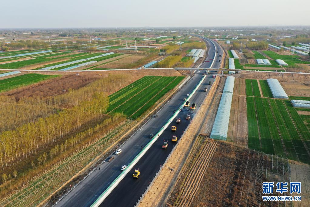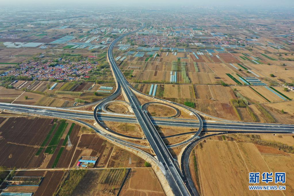 这是京德高速(一期工程)千人目互通建设现场(4月7日摄,无人机照片)。新华社记者 牟宇 摄