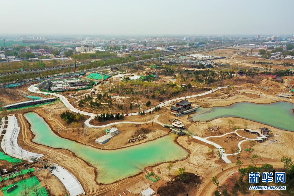 这是4月9日拍摄的雄安新区悦容公园建设现场(无人机照片)。新华社记者 牟宇 摄