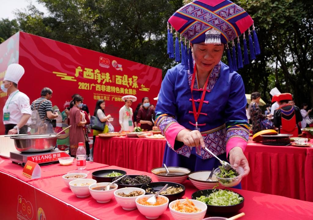活动现场,1.8米长的壮族五色糯米饭、香味四溢的瑶乡油茶等美食吸引各地游客驻足观赏。除美食外,还有多名非遗美食技艺传承人现场“掌勺”,展示和演绎各种传统非遗美食制作技艺,更有“网红”主播身着少数民族服装,通过直播平台向“云端”观众介绍广西非遗特色美食——柳州螺蛳粉、南宁粉虫等菜品。