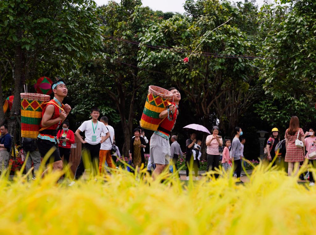 在河池市都安瑶族自治县,当地举办乡村振兴农民文化艺术节暨农民时装秀非遗展演活动,来自全国各地的上千名游客与当地各族群众赏壮瑶美裳、品特色美食;在柳州市融水苗族自治县,各族同胞举办苗寨招婿、拉鼓比赛、芒蒿送福及民族服饰走秀等传统民俗活动;在桂林市兴安县,花炮、珍珠球、板鞋竞速、高脚竞速、陀螺、独竹漂、舞狮等民族传统体育项目热力登场,趣味体育项目互动“赚足”欢笑声……