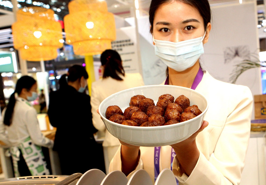 工作人员在第三届进博会展台展示刚出炉的植物蛋白肉丸。新华社记者 陈飞 摄