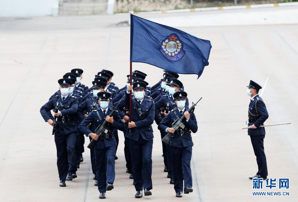 鲜艳的五星红旗,被香港警察学院升旗手奋力一挥,迎风飘展,徐徐直上。