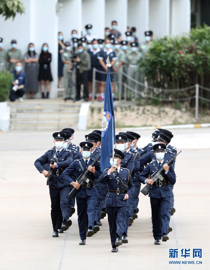 上午10时许,在香港警察学院,随着警察乐队奏响《歌唱祖国》,国旗方队踢正步入场。“向右看齐”“向前看”“向国旗敬礼”,在雄浑有力的口令指挥下,国旗方队迅速完成转体转身、立定靠脚等一系列动作。