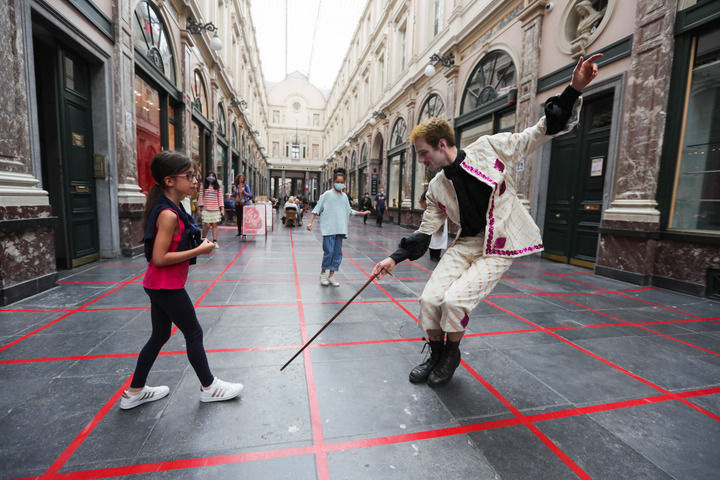 这是2020年7月15日,戏剧艺术家在比利时布鲁塞尔市中心与一名女孩互动“格子游戏”。此互动躲避游戏旨在提示人们在新冠疫情期间注意保持社交距离。 新华社记者 郑焕松 摄