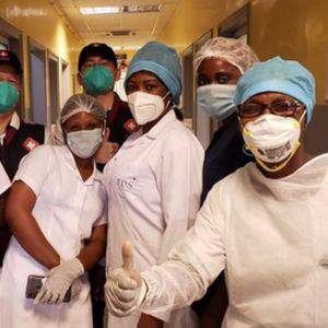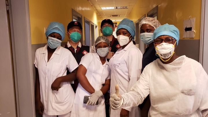 这是2020年5月26日,中国抗疫医疗专家组在刚果(布)首都布拉柴维尔指导新冠肺炎病房建设时,与当地一线医务人员合影。 新华社发