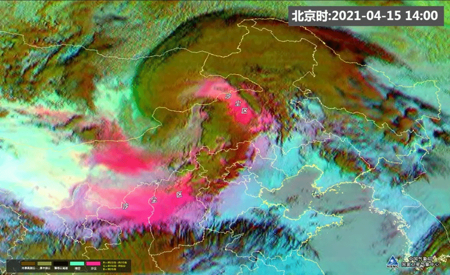 FY-4A气象卫星沙尘监测图(粉红色区域),2021年4月15日14:00(北京时)
