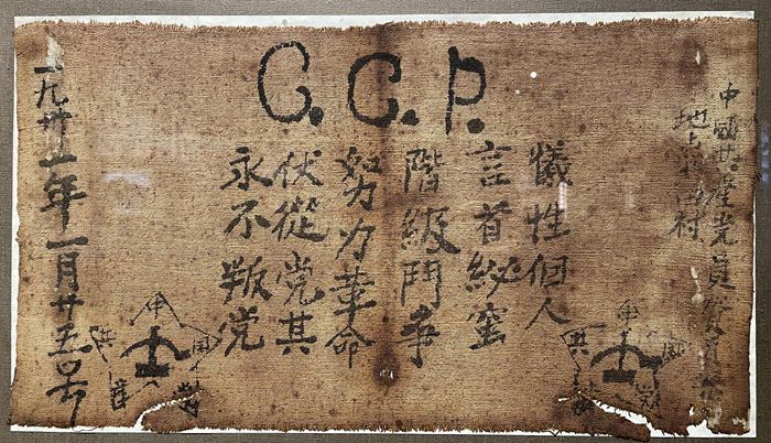 1931年1月25日,在榨油坊昏暗的油灯下,他拿出一块早已准备好的红布,在上面写下了那段誓词,并留下了自己的名字和入党的时间、地点。