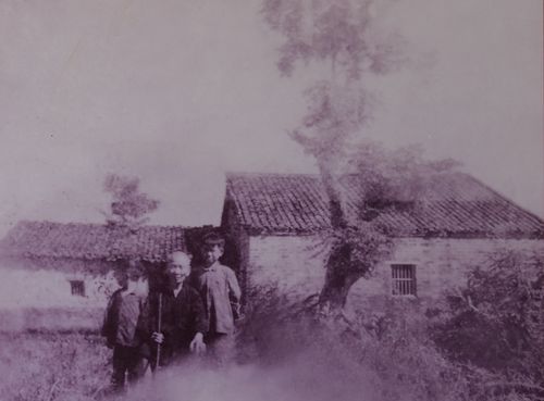 上图为贺佐武(左一)、贺佐文与爷爷贺页朵在榨油坊前的合影。