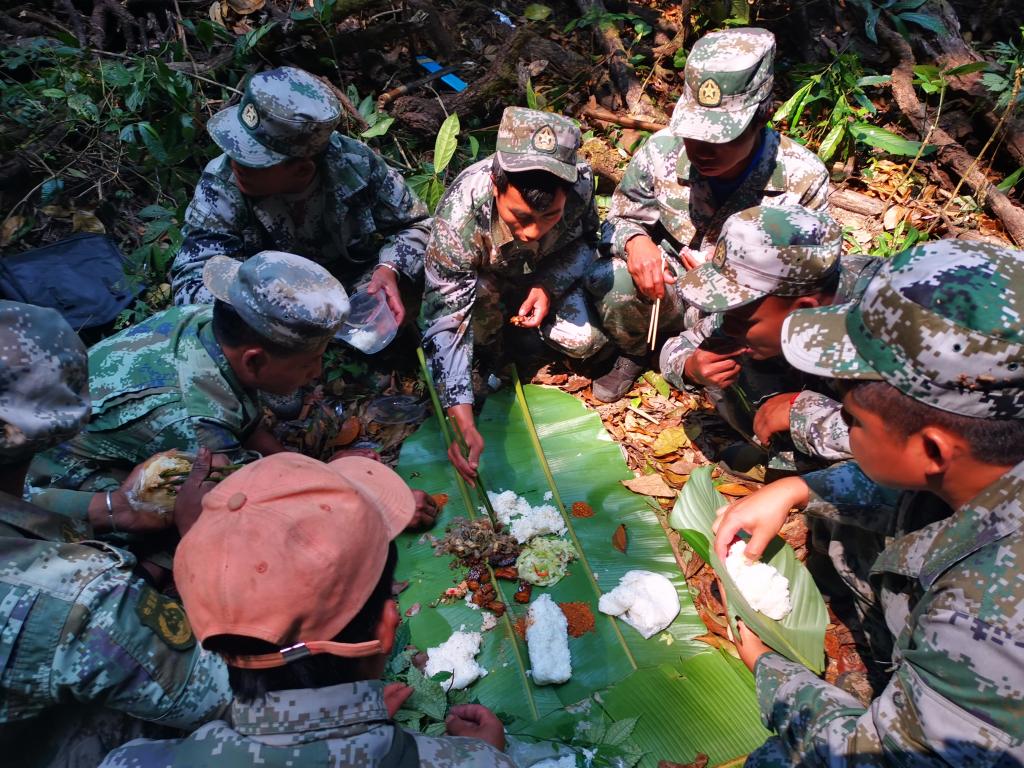 2021年4月8日,岩帕坎(右一)与其他护林队员一起巡山,就地吃午饭。(勐海县委宣传部供图)